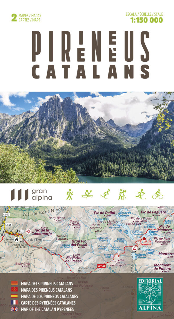 Característiques: 2 mapes a escala 1:150.000 (Pirineu català occidental i Pirineu català Oriental) amb informació essencial de caire turístic i excursionista de tot l?àmbit del Pirineu Català: vies de comunicació, poblacions, cims, refugis de muntanya, senders de Gran Recorregut, ports i colls de muntanya, àrees d?autocaravanes i punts d?interès.